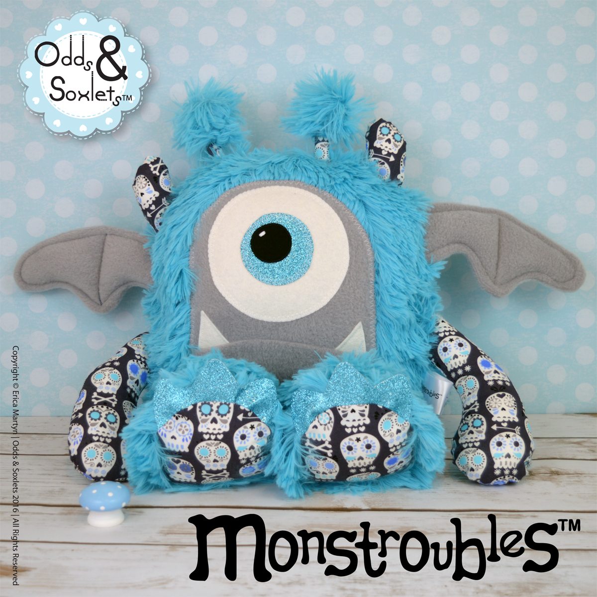 Published February 3, 2016 at 1200 × 1200 in Monstroubles-Batch-05-NEW-MONSTERS-6g-2016-001-BED-Turquoise-Fluffy-Dark-Sugar-Skulls-Odds-and-Soxlets-Copyright-Erica-Martyn-PREVIEW-Square-FULL